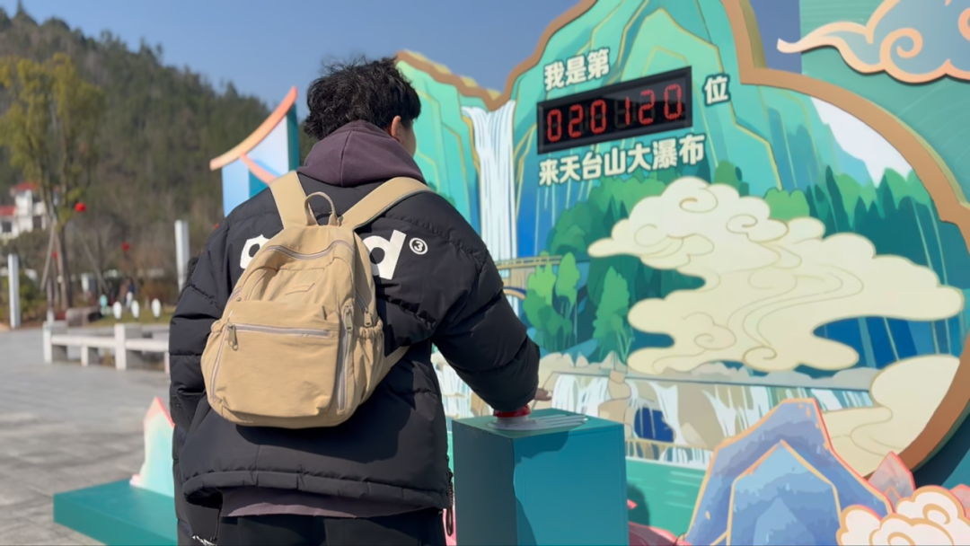 游客与“飞瀑纳新”电子打卡合影。