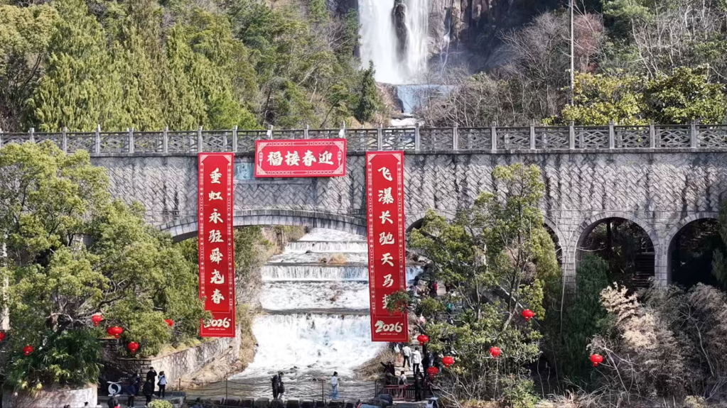 巨型对联前游客拍照,背景是壮观的瀑布。