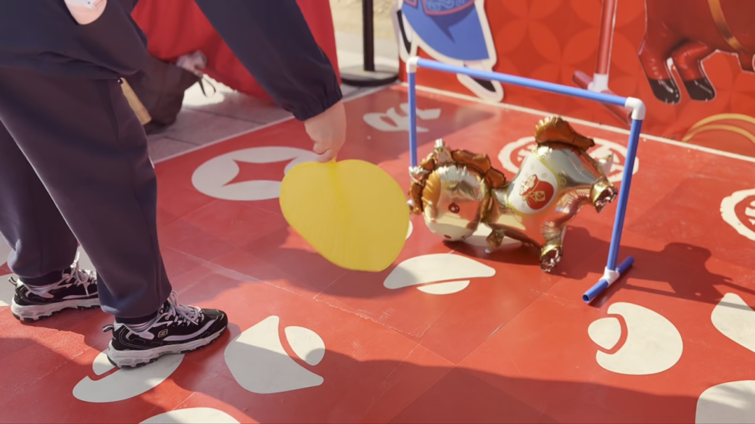 马到成功,充气小马在扇子指挥下滚进球门,妙趣横生。
