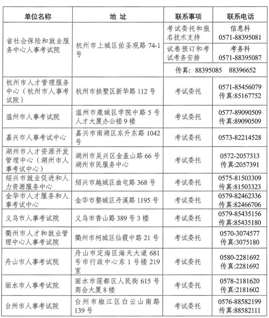 浙江省、市人事考试机构联系方式