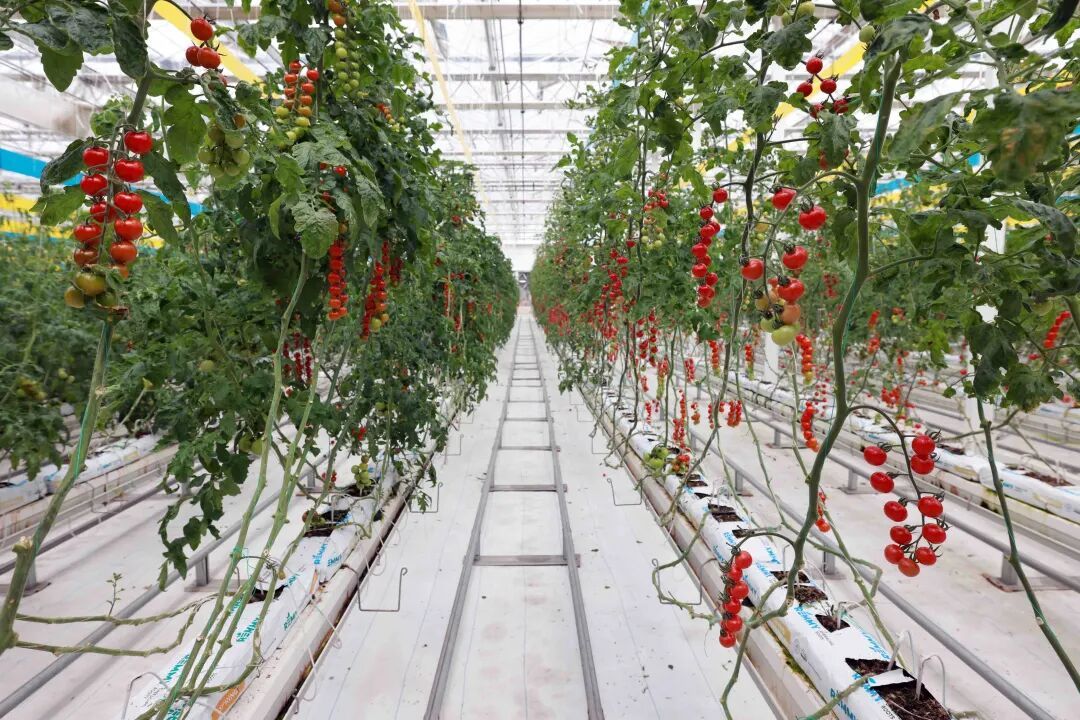 秧苗2米多高,果实如同一串串葡萄,在长秀村农业创业创新孵化园的智能温室大棚,一行行串收番茄成熟丰收,以订单模式销往沪杭等地的商超。