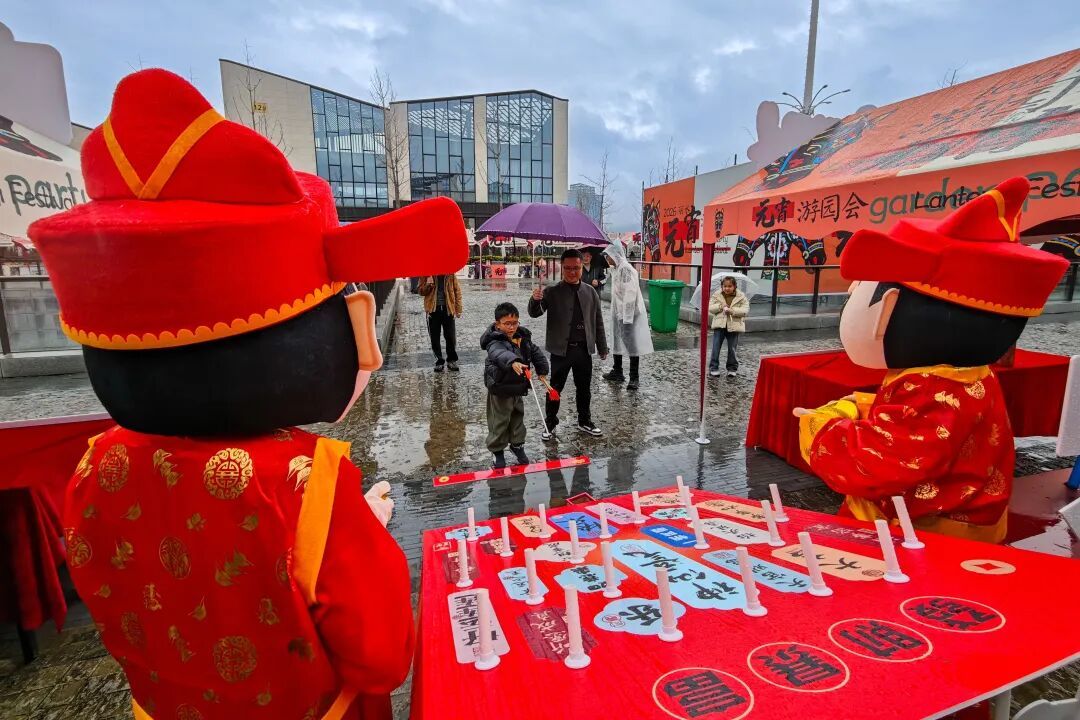 步入瓯江文苑主广场,元宵主题打卡墙错落布置,浓郁的节日喜庆氛围扑面而来。市集上,近30个特色摊位两侧整齐排开,炒米糖、绘糖画等特色小吃的香气萦绕,非遗手作、石雕展示引得游客驻足观赏;财神人偶不定时现身,全程花式巡游送福,免费向游客派发元宝巧克力……