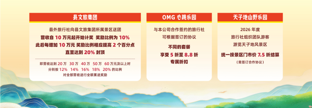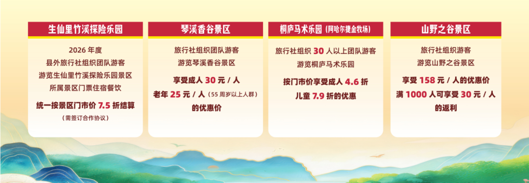 现场发布了2026年桐庐旅游企业旅行商合作政策,涵盖国有景区流量奖励,OMG心跳乐园合作套餐,天子地、生仙里和琴溪香谷团队优惠价,桐庐马术乐园和山野之谷的团队惊喜价等多项内容。