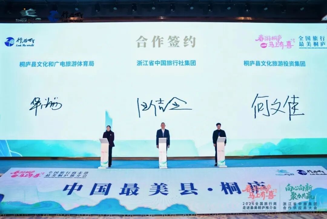 作为本次活动的一大亮点,桐庐县人民政府与浙江省旅游投资集团达成深度战略合作。在与会嘉宾的共同见证下,桐庐县文化和广电旅游体育局、桐庐县文旅集团与浙江省中国旅行社集团签署战略合作协议,三方将在资源共享、品牌推广、客源引流、产品开发等方面开展全方位合作。同时,现场还举行了“桐庐旅游与全国旅行商友好合作启动仪式”,标志着桐庐文旅与全国业界迈入“彼此赋能、互相成就”的全新阶段。