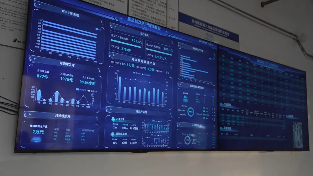 不止于设计,嘉溢制衣投入了300多万元引入AI大模型和数字化系统,生产效率提升了约5%,产品质量提升了10%,交付周期从10周以上压缩至4周以内。丁永国告诉记者:“AI还提升了精准度,以前客户来选款,一百个款式里能选中二三十个就不错了,现在选中率能超过50%。”