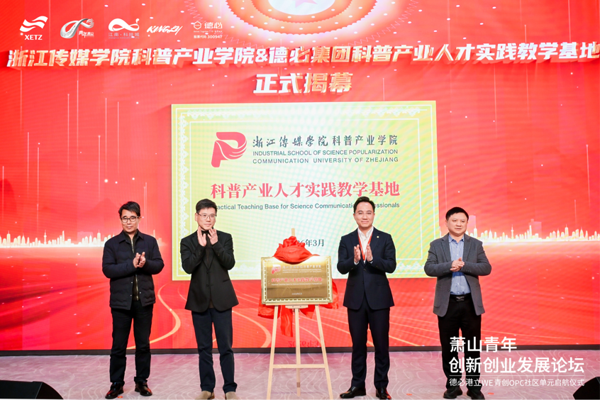 活动现场,政企校社多方聚力赋能,一系列重磅合作与举措同步落地,构建萧山青年创新创业的赋能矩阵。浙江传媒学院科普产业人才实践教学基地在德必港立WE正式揭牌,校地双方深化产教融合、协同育人,打通“高校育才—基地实践—产业转化”全链条,为人工智能、数字传媒、科普创新等领域培育高素质青年人才,夯实区域创新发展人才培育;“致公之家”授牌仪式同步开展,依托致公党侨海特色链接海内外资源,为青创事业注入全球化动能,助力企业跨境出海。