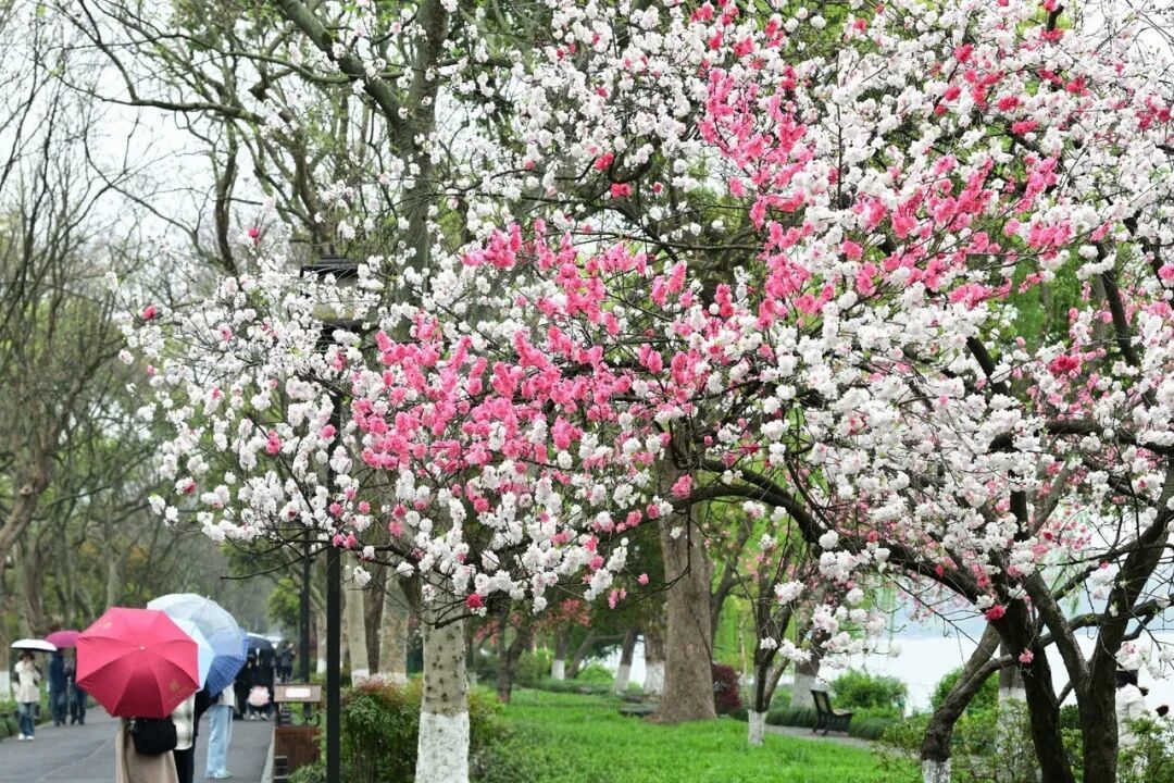 3月31日,冒雨赏花的杭州市民。里尔 摄