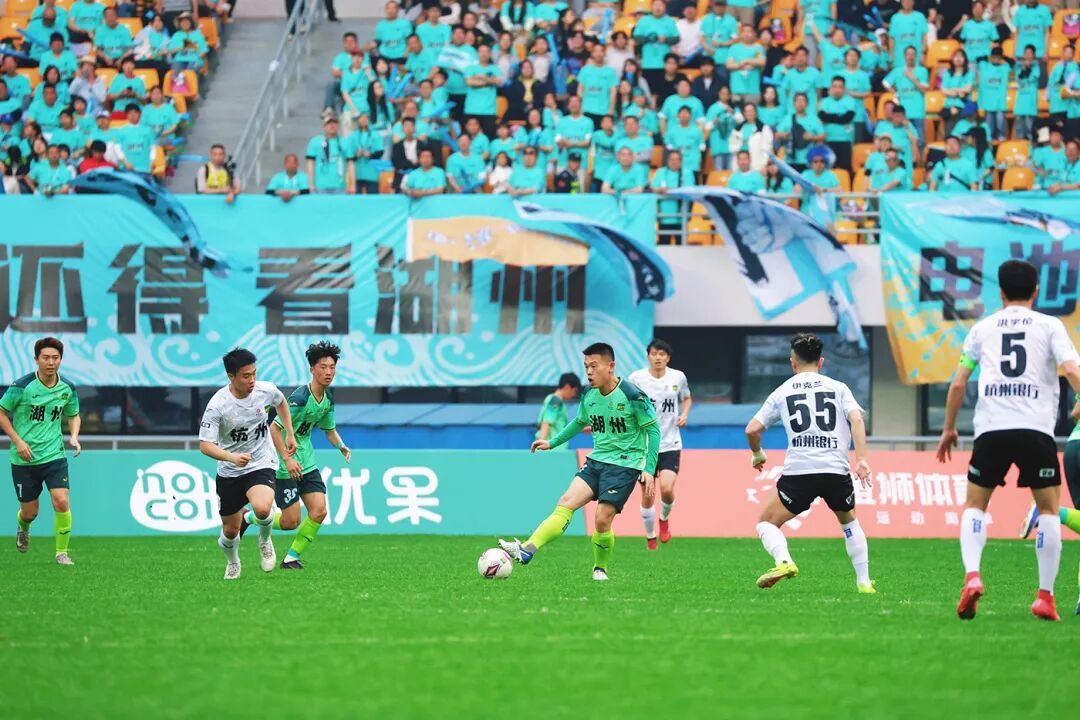 15时30分,随着主裁判的一声哨响,比赛正式开始。双方球员迅速进入状态,进攻犀利,防守严密,展现了良好的精神风貌和竞技状态。看台上,双方球迷摇旗呐喊,欢呼声、掌声此起彼伏。比赛进行到第15分钟,杭州队前锋禁区内一脚劲射,率先取得进球,并将1:0的比分保持到上半场结束。下半场,双方易边再战。湖州队球员不惜体力积极奔跑、全力拼抢,终于打进一粒头球,现场爆发出山呼海啸般的喝彩声。此后,比赛进入胶着状态,两队都没有再取得进球,比分最终被定格在1:1。