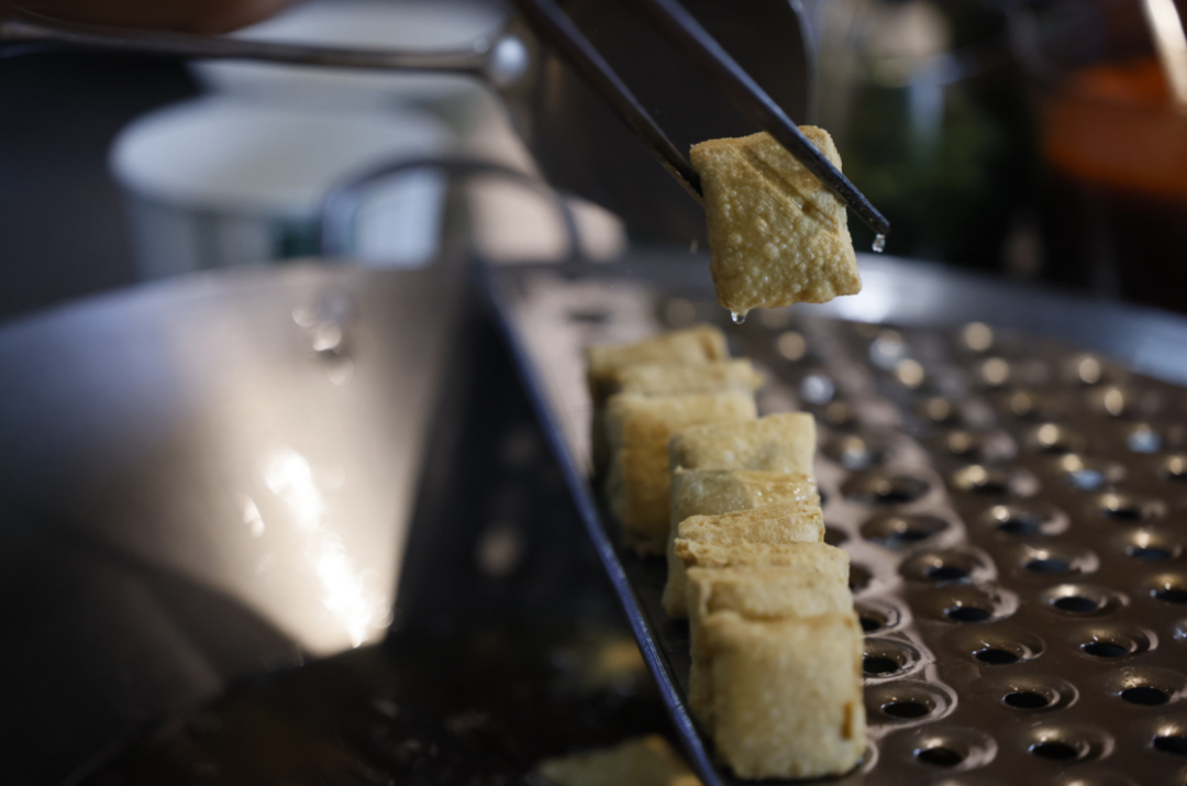 作为展示西塘当地文化脉络的一个美食符号,管老太臭豆腐至今沿用传统制作方法,以本地优质黄豆为原料,通过浸泡、磨浆、点浆等古法工序制成豆腐坯,再放入用苋菜梗、雪菜等做成的卤水,浸泡10至14小时后,最后以香味浓郁的菜籽油或花生油,在合适的油温下现炸至表面起泡,淋上秘制酱料与蒜蓉、香菜等调味,其口感外酥内嫩,臭香浓郁且辣中带鲜,兼具独特风味与层次感。