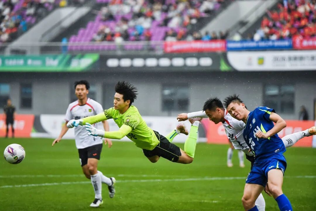 第69分钟,嘉兴队起脚射门,蒋俞涛发挥稳健,奋力一脚挡出必进球。