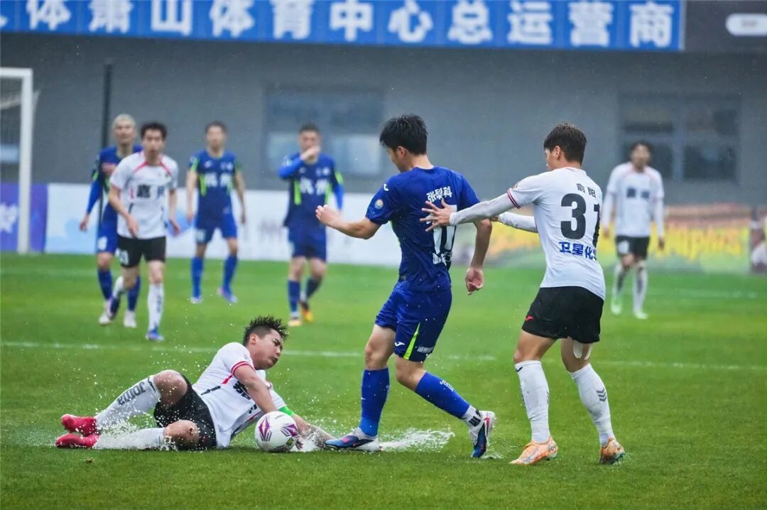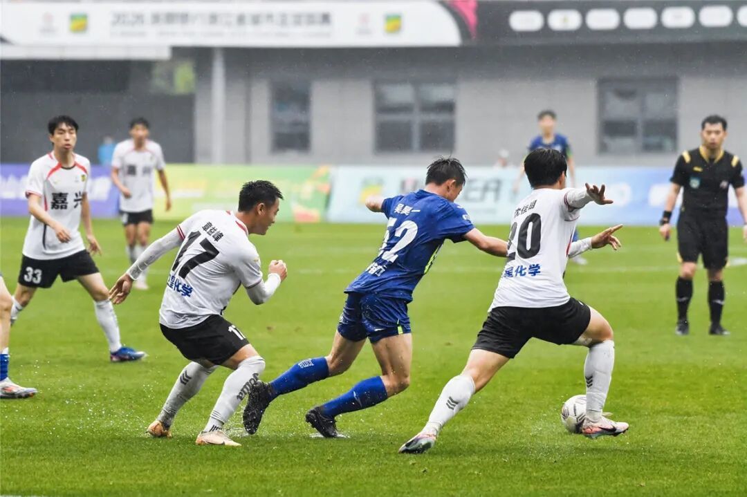 现场雨势不减,湿滑的场地对球员的考验进一步加剧,但球员们拼劲十足。张梨科在拼抢中受伤,经过简单治疗后重返赛场,顽强坚持。
