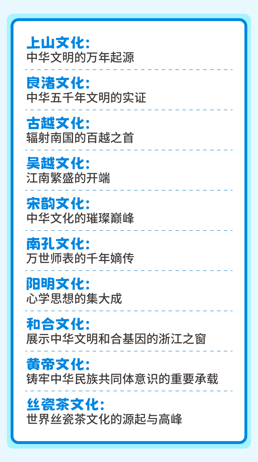2024年,省文化广电和旅游厅启动实施了文化基因激活工程,首次提出了10大现象级省域文化标识,分别是:上山文化、良渚文化、古越文化、吴越文化、宋韵文化、南孔文化、阳明文化、黄帝文化、和合文化与丝瓷茶文化,逐个开展专项解码研究,讲清楚“浙江的文化有什么”,绘制文化标识图谱,初步构成了“何以浙江”的阐释体系。跟着文化标识游浙江,能让你更好地了解何以浙江,知晓脚下这片大地从何而来。