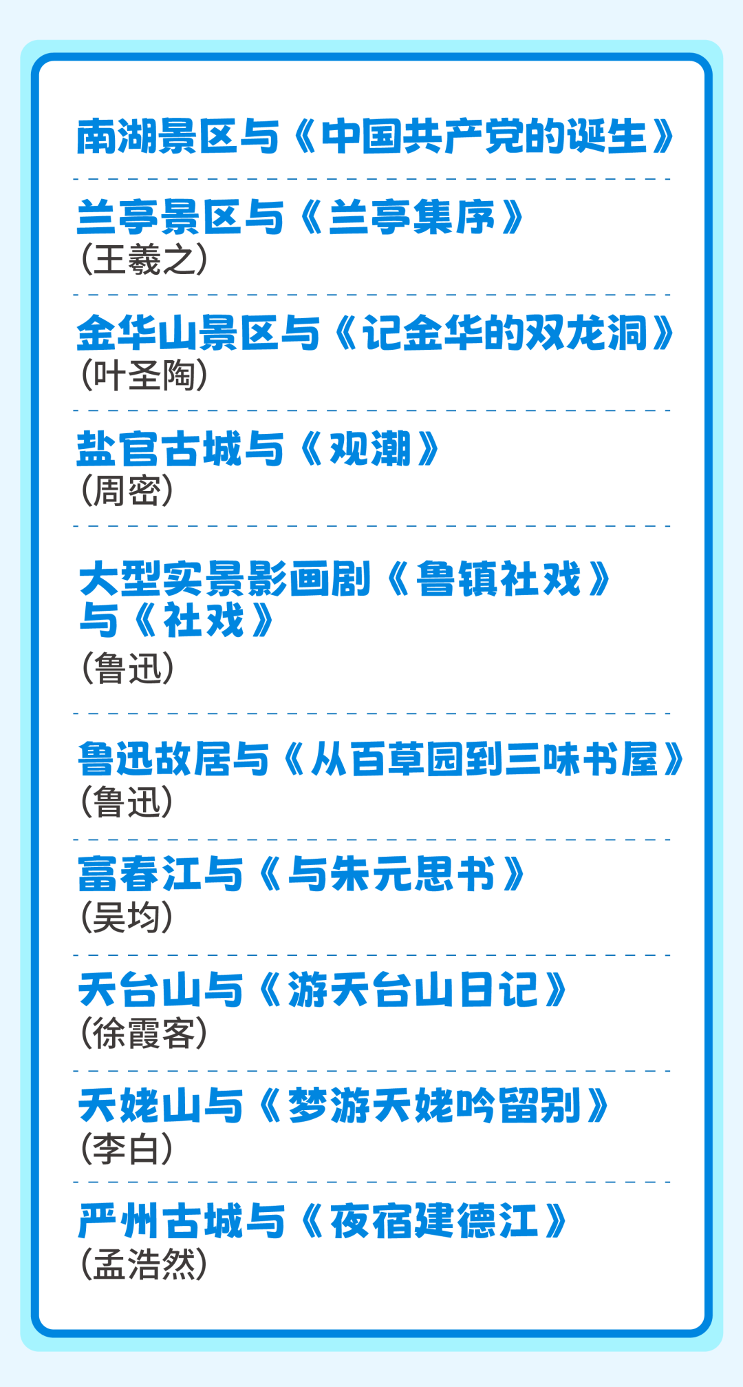 浙江,是名士大家的故乡,也是传奇故事的摇篮。据不完全统计,仅纳入史册记载的浙江籍名人就达到1600余人之多。他们的思想、言行、技艺是浙江大地深沉的文化基因的重要组成部分。这个春假,让我们循着名人的足迹,开启一场穿越时空的对话。去绍兴,在鲁迅故居和沈园,感受文豪的犀利与诗人的深情;赴文成,探访刘伯温故里,领悟一代智者的传奇人生。从西施故里的浣纱传说,到乌镇的文人风骨;从严子陵钓台的隐逸风骨,到金庸笔下的江湖豪情。每一处风景,都因名人而熠熠生辉。带上这份《指引》,在行走中读懂历史,在山水间邂逅名人,让文化之旅充满温度与深度。