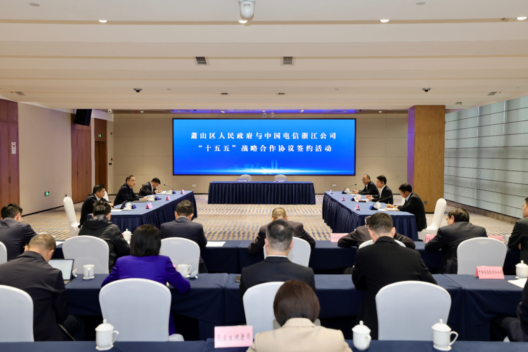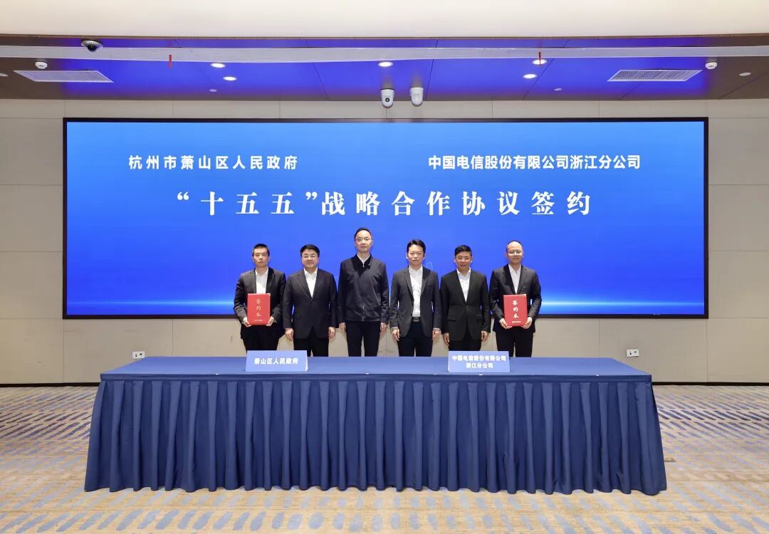 4月23日下午,萧山区人民政府与中国电信浙江公司签订“十五五”战略合作协议。杭州市委常委、萧山区委书记孙旭东,中国电信浙江公司党委书记、总经理李云庄见签并致辞。萧山区领导姜永柱、朱国军,中国电信浙江公司有关负责人刘小忠、施桂才出席。