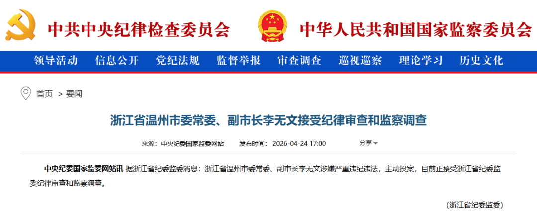 据浙江省纪委监委消息:浙江省温州市委常委、副市长李无文涉嫌严重违纪违法,主动投案,目前正接受浙江省纪委监委纪律审查和监察调查。